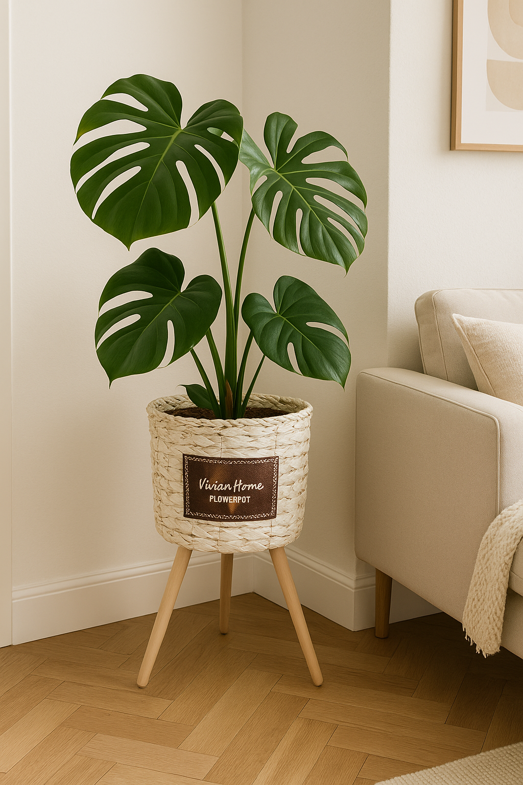 Su cuerpo tejido a mano aporta textura y calidez, mientras que las patas de madera clara estilo nórdico elevan tu planta para convertirla en protagonista.